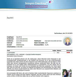 Du bekommst von mir den Test per Mail. Nachdem Du den Test durchgeführt hast wird Deine Auswahl an mich gesendet. Diese ist die Grundlage für den Scan per Computertechnologie mit den von mir gewählten Datenbanken, u.a. den original Resonalogic Datenbanken von Carsten Pötter.